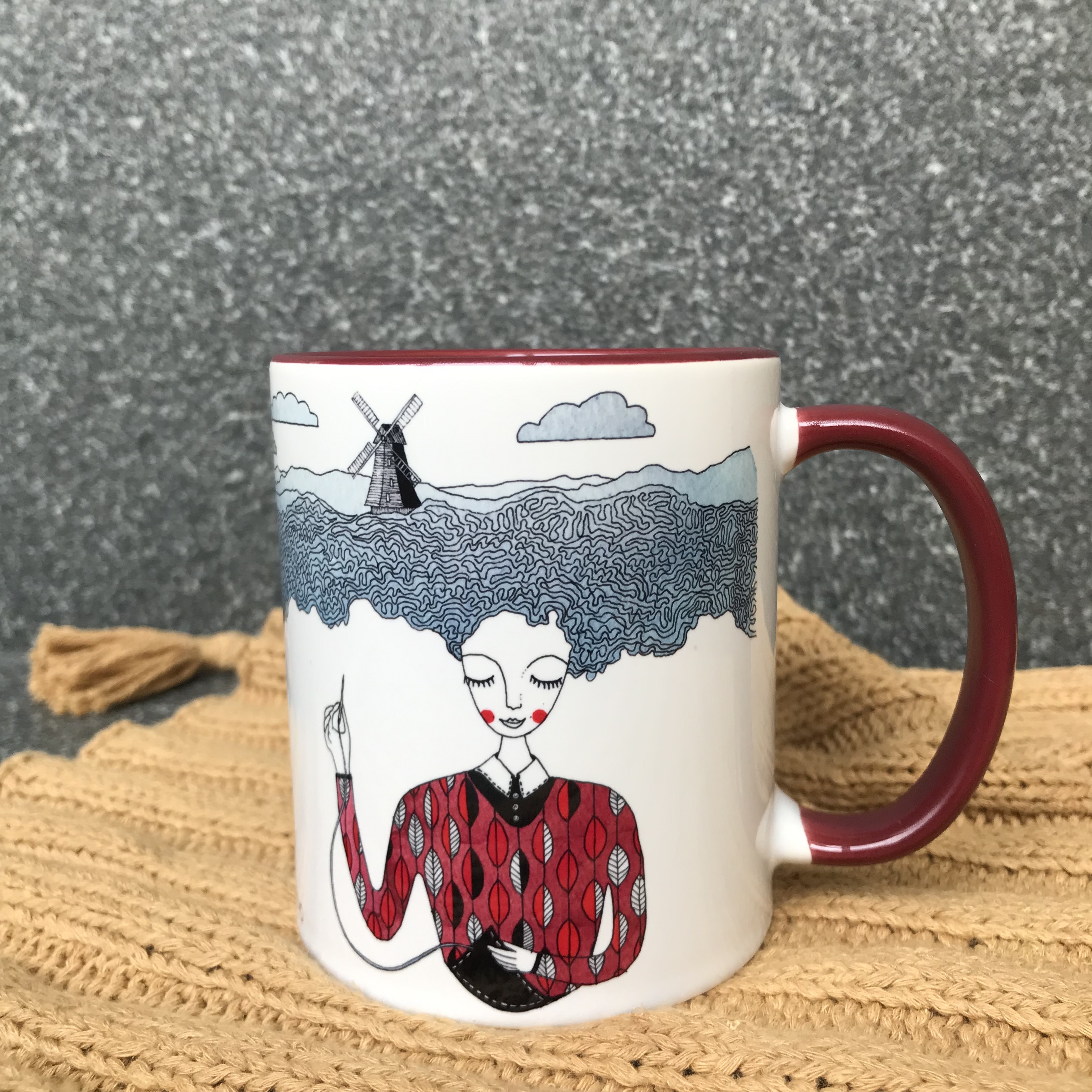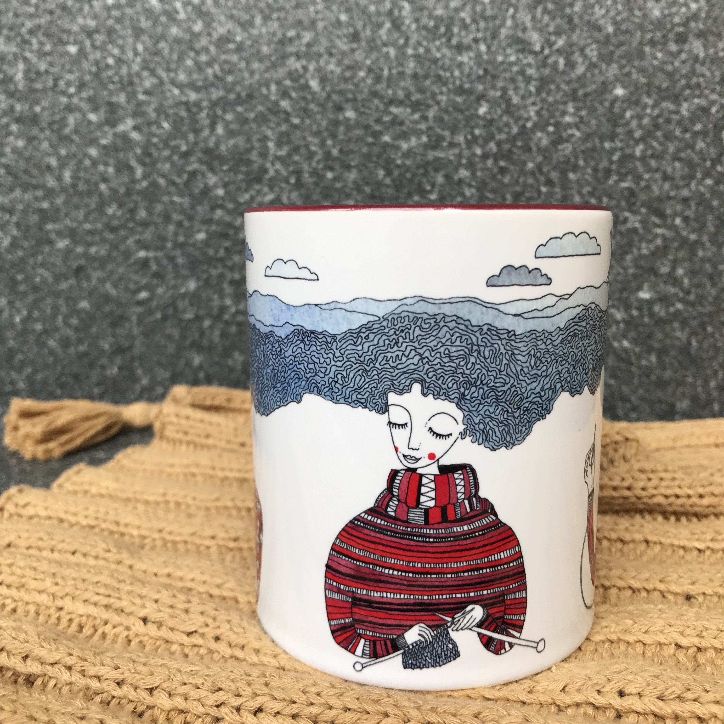 杯身上有正在勾針編織, 棒針編織和手縫的手作者